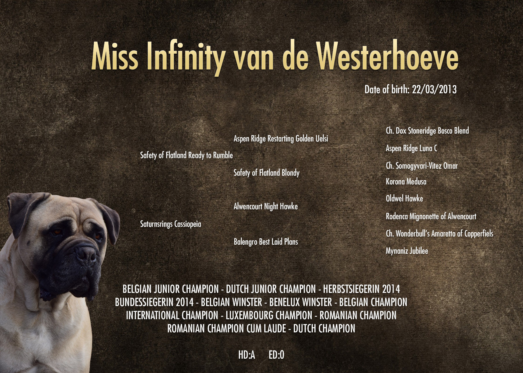 Belgian Junior Champion - Dutch Junior Champion - Herbstsiegerin 2014 - Bundessiegerin 2014 - Belgian Winster - Benelux Winster - Belgian Champion - International Champion - Luxembourg Champion - Romanian Champion -